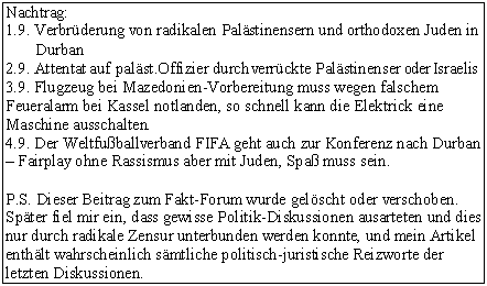 Nachtrag 30.8.:Bei der UNO-Weltkonferenz wird mehrheitlich Rassismus mit Zionismus gleichgesetzt wie bei Helsing abgeschrieben.Da haben wohl „rechte deutsche Spinner“ den Laden übernommen und manipuliert. Der Schily hat versagt und ist schuld! Der Hesemann soll ihn anzeigen !! Im Auftrag der Inquisition ! („meiner“ Bürgerinitiative)Gefunden auf aol-Portal:Durban (dpa) - UN-Generalsekretär Kofi Annan und Südafrikas Präsident Thabo Mbeki eröffnen heute die UN-Weltkonferenz gegen Rassismus in der südafrikanischen Stadt Durban. Bereits im Vorfeld wurde die Konferenz vom Nahost-Konflikt und Boykottdrohungen überschattet. Wegen der beabsichtigten Gleichsetzung von Zionismus mit Rassismus wollen die USA und Israel nur kleinere Delegationen schicken. In den USA und Europa stießen auch Forderungen nach Entschädigung für Sklaverei und Kolonialismus auf Ablehnung.