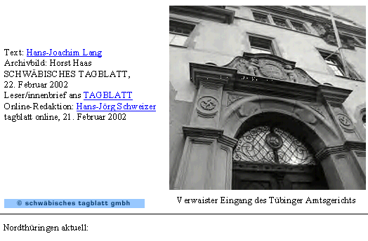 Haug ist in Tübingen kein Unbekannter, hier begann vor zweieinhalb Jahren seine Karriere als Politiker. Als Kandidat der WUT schickte er sich an, in den Gemeinderat und in den Kreistag einzuziehen. Doch dem Wahlvolk fehlte der Blick für seine politische Berufung und ließ ihn mit 1412 Stimmen (Gemeinderat) beziehungsweise mit 815 Stimmen (Kreistag) durchfallen. Seither ist er in der Kommunalpolitik passiv, alles andere brächte ihn in seiner neuen Position wohl auch in Erklärungsnöte. Denn Haug, vor drei Jahren in unserer Zeitung noch als Physiker (s)einer Ein-Mann-Firma porträtiert, ist nicht Staatssekretär des Bundesinnenministeriums, sondern Staatssekretär der „kommissarischen Regierung des Deutschen Reichs“. Als solcher ist er, wie er uns gestern am Telefon versicherte, seit dem 25. Mai vorigen Jahres im Amt. Bezahlt werde er nach der Reichsbesoldungsordnung. „Davon kann man gut leben.“